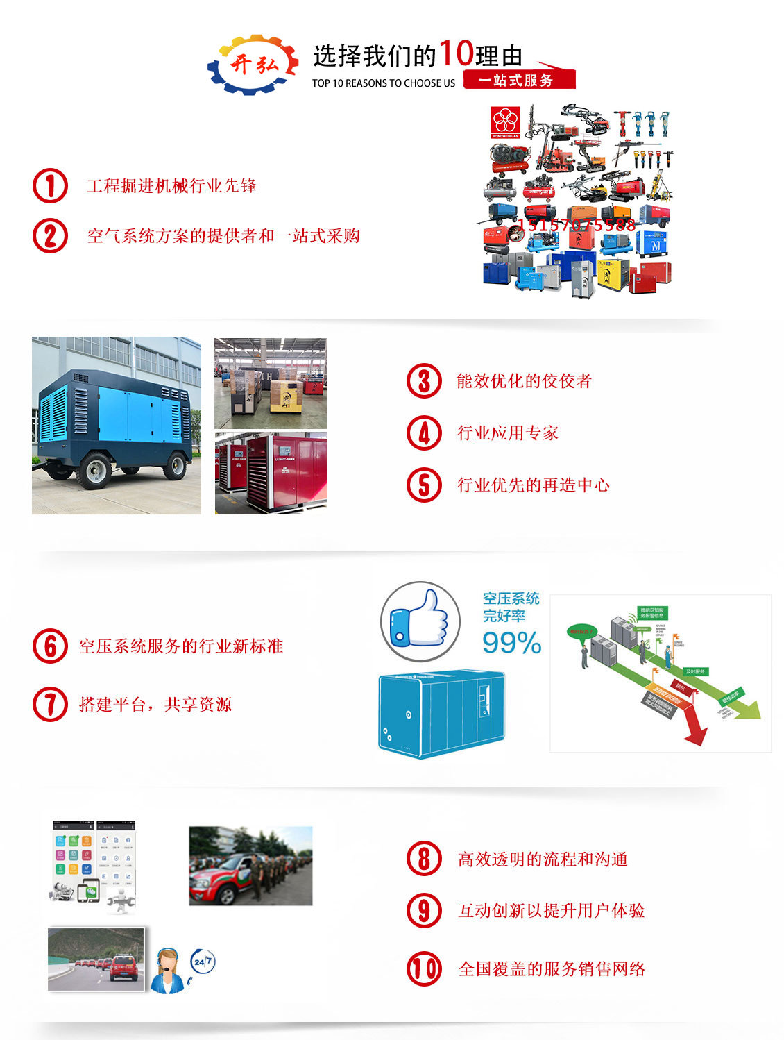 ? ? ? ? 衢州開弘機械設備有限公司是紅五環授權的經銷商,主要經營產品有:工程掘進:履帶式潛孔鉆車,鉆機,水井鉆,錨固鉆機,鑿巖機,風鎬及各類鉆具配件;空氣動力:干式無油空壓機、螺桿式空壓機、高壓螺桿空壓機,活塞式空壓機,高壓活塞空壓機,無油靜音活塞機,節能產品及改造方案、冷凍式干燥機、吸附式干燥機、儲氣罐、精密過濾器、空壓機配件等,并提供空壓站壓縮動力系統設備的選型設計、供應、安裝、調試等一體化服務。產品主要涉及的行業:機械制造、食品行業、水泥制造、化工廠、水電廠、火電廠、鍛造車間、鑄造車間、玻璃廠、鋼材廠、鈑金車間、礦山、煉油廠、藥品制造、塑料行業、印刷廠、采石場、橡膠廠、紡織廠、軍工等行業,并廣泛應于國家大型項目中。